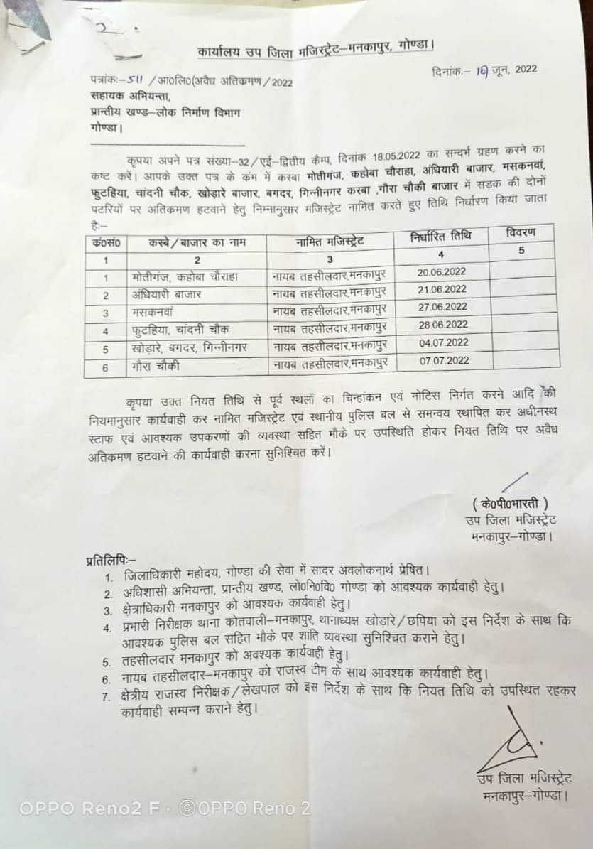 नायब तहसीलदार मनकापुर अतिक्रमण विरोधी अभियान का नेतृत्व करेंगे । इस बीच मोतीगंज और कहोवा चौराहे पर अतिक्रमण चिन्हित कर अतिक्रमणकारियों को नोटिस जारी किया गया है ।इसी क्रम में 21 जून मंगलवार को अंधियारी बाजार में जबकि 27 जून को मसकनवा बाजार में अतिक्रमण विरोधी अभियान चलाया जाएगा । उप जिला मजिस्ट्रेट के पी भारती के अनुसार 28 जून को फुटहिया बाजार व चांदनी चौक में अतिक्रमण विरोधी अभियान चलेगा ।