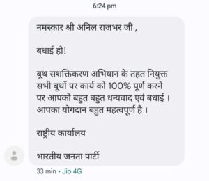 बीजेपी नेता अनिल राजभर को भेजे गए बधाई संदेश में बूथ सशक्तिकरण अभियान के तहत नियुक्त सभी बूथों पर शत प्रतिशत काम करने के लिए बधाई का संदेश बीजेपी के राष्ट्रीय कार्यालय से प्राप्त हुआ बधाई संदेश पाकर अनिल राजभर ने खुशी जाहिर करते हुए कहा कि पार्टी द्वारा यह बधाई संदेश भेजना पार्टी के छोटे छोटे कार्यकर्ताओं का मनोबल बढ़ाने तथा पार्टी को मजबूत करने में बहुत ही लाभदायक साबित होगा।