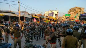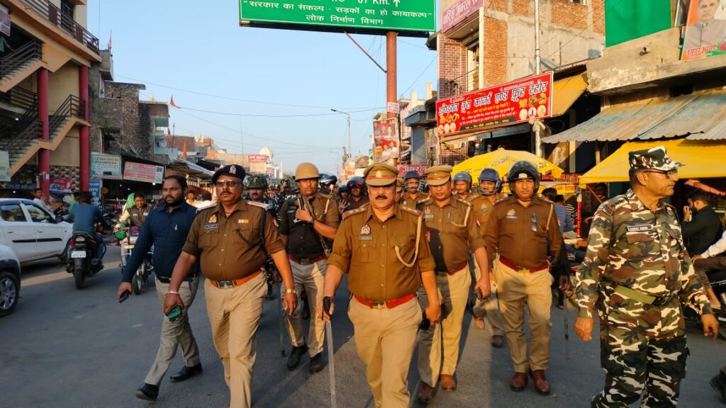 बभनजोत गोंडा। आगामी लोक सभा चुनाव- 2024, होली, रमजान माह व नागरिकता संशोधन अधि0 लागू होने के दृष्टिगत क्षेत्राधिकारी मनकापुर व थाना प्रभारी निरीक्षक खोड़ारे द्वारा जनता में शांति व सुरक्षा का भाव उत्पन्न करने हेतु अर्धसैनिक बल (CISF) एवं पुलिस बल के साथ थाना खोड़ारे के अल्लीपुर बाजार, चंद्रदीप घाट, गौरा चौकी बाजार विभिन्न ग्राम मोहल्लों व चौक चौराहे पर किया रूट मार्च।