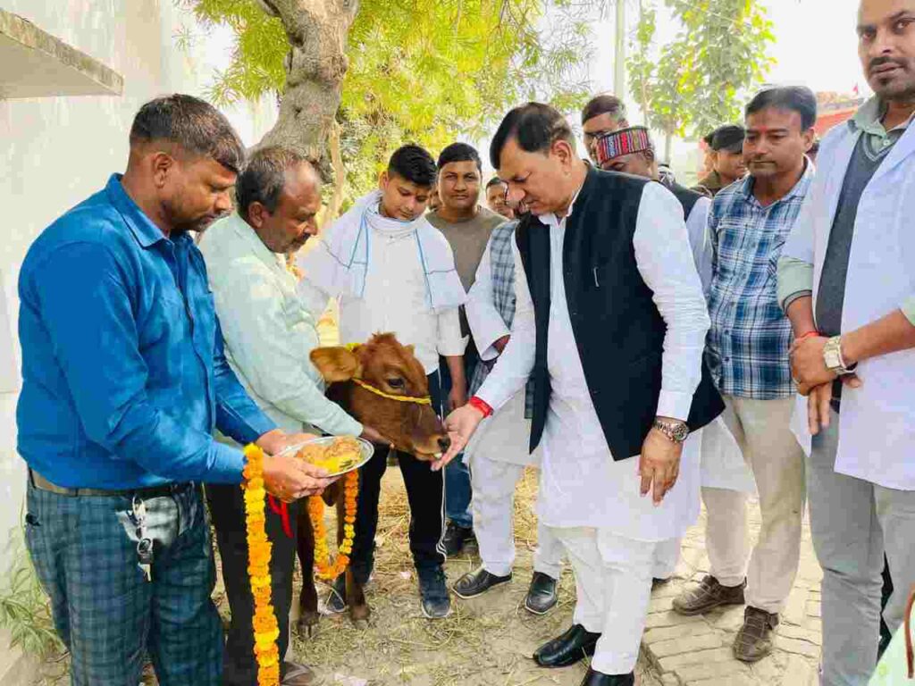 छपिया गोंडा। पंडित दीनदयाल पशु आरोग्य मेला योजनांतर्गत शनिवार को विकासखंड छपिया के ग्रामपंचायत दरियापुर में आयोजित पशु आरोग्य मेला का उद्घाटन बतौर मुख्य अतिथि के रूप में विधायक प्रभात कुमार वर्मा पहुंच कर मेले का शुभारंभ किया तथा किसानों को निशुल्क दवाइयां वितरण किया गया विधायक प्रभात वर्मा ने अपने संबोधन में बताया कि किसान अच्छी नस्ल के पशुओं को पालने का इस अवसर पर मुख्य रूप से मौजूद रहे डा.विशालयाद, डा.जगदीश मौर्य,डा.आशीष सिंह,सत्य प्रकाश वर्मा दयाशंकर पांडे, पप्पू द्वेदी, विश्वनाथ यादव, विजय यादव, चंद्रिका,पिंटू वर्मा, विक्रम प्रसाद,एवं भारी संख्या में किसान मौजूद रहे